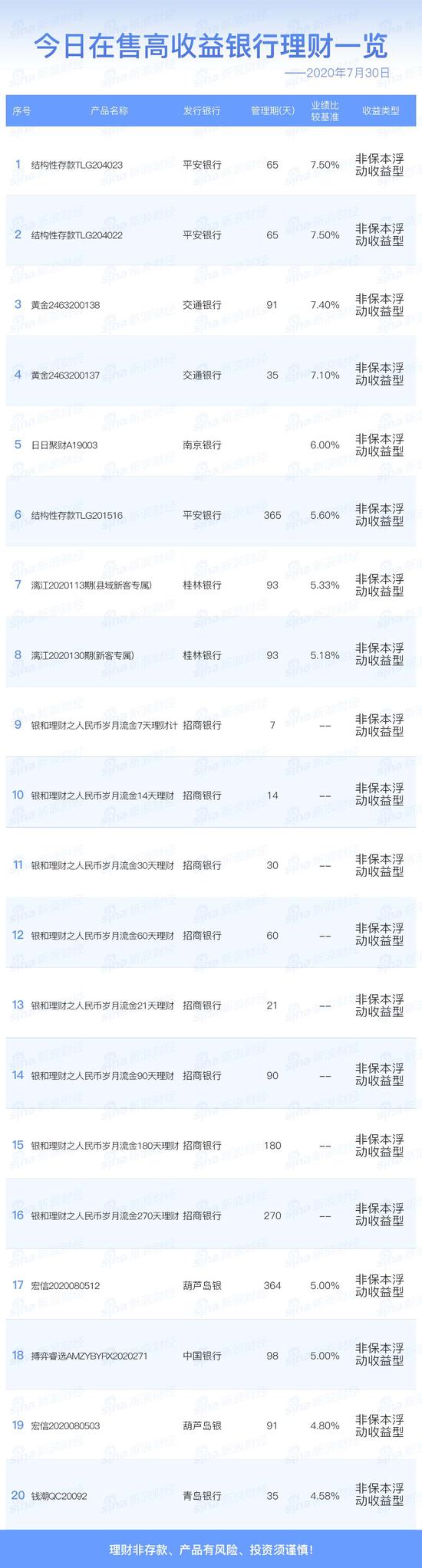 7月30日在售高收益银行理财产品:今日业绩比较基准在7.00%及以上的银行人民币理财产品共4款。平安银行(13.430, -0.11, -0.81%)的“结构性存款TLG204023”和“结构性存款TLG204022”业绩比较基准最高,同为7.50%。