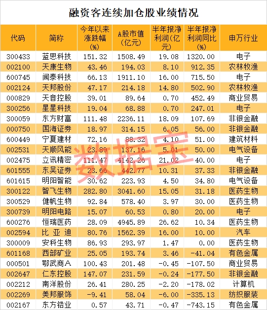 从二级市场表现来看,融资客连续加仓6周以上的股票整体大幅跑赢大盘,年内平均涨幅达到52.17%。智飞生物、君正集团、山东药玻、双林生物、蓝思科技等股年内累计涨幅翻倍。智飞生物累计涨幅282.8%排在首位,该股是国内疫苗行业龙头之一,产品主要布局在细菌类多联多价疫苗、病毒类疫苗以及结核防治类三大板块。上半年公司实现盈利15.05亿元,同比增长31.18%。