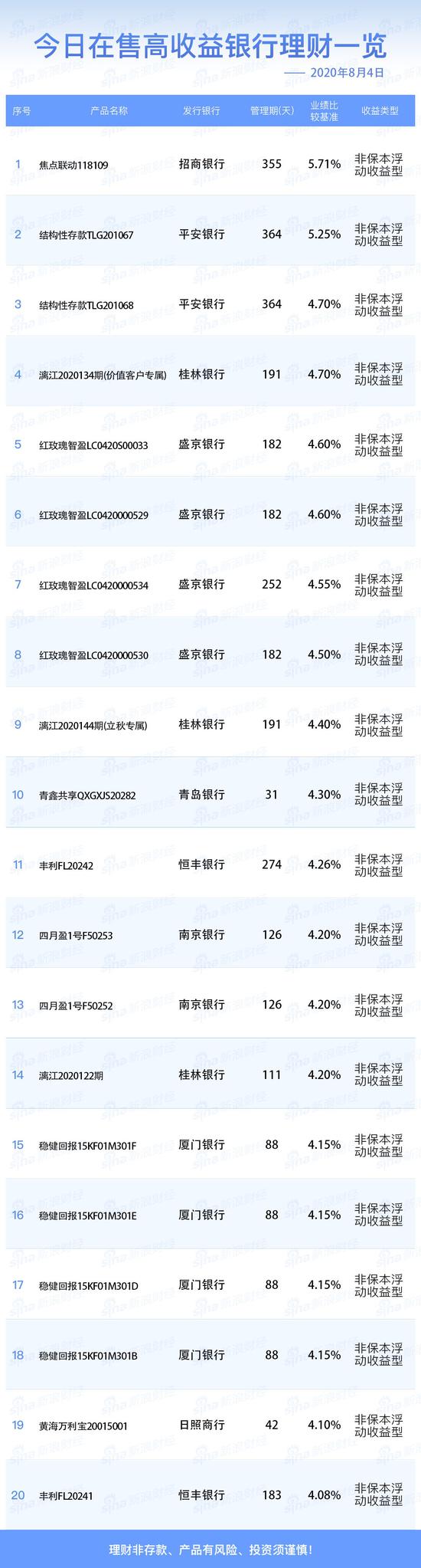 8月4日在售高收益银行理财产品:今日业绩比较基准在5.00%及以上的银行人民币理财产品共2款。招商银行(36.750, 1.75, 5.00%)的“焦点联动118109”业绩比较基准最高,为5.71%。