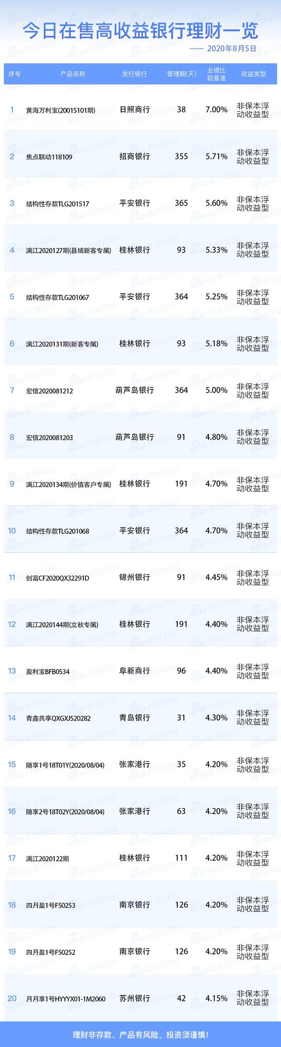 8月5日在售高收益银行理财产品:今日业绩比较基准在7.00%及以上的银行人民币理财产品共1款。日照商行的“黄海万利宝(20015101期)”业绩比较基准最高,为7.00%。
