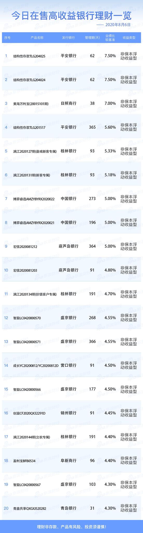 8月6日在售高收益银行理财产品:今日业绩比较基准在7.00%及以上的银行人民币理财产品共3款。平安银行(13.740, -0.02, -0.15%)的“结构性存款TLG204025”和“结构性存款TLG204024”业绩比较基准最高,为7.50%。