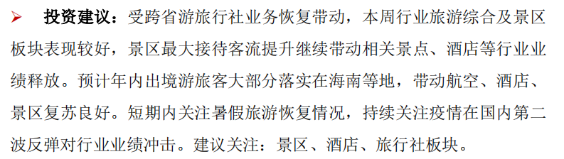 另外,山西证券表示,预计年内出境游旅客大部分落实在海南等地,带动航空、酒店、景区复苏良好。短期内关注暑假旅游恢复情况,持续关注疫情在国内第二波反弹对行业业绩冲击。建议关注:景区、酒店、旅行社板块。