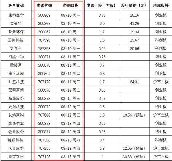本周11只创业板注册制新股,分别为8月10日星期一的3只:圣元环保、杰美特、康泰医学;8月11日星期二的3只:南大环境、欧陆通、回盛生物;8月12日星期三有3只:天阳科技、海晨股份、蒙泰高新;8月13日星期四有2只:金春股份、维康药业。