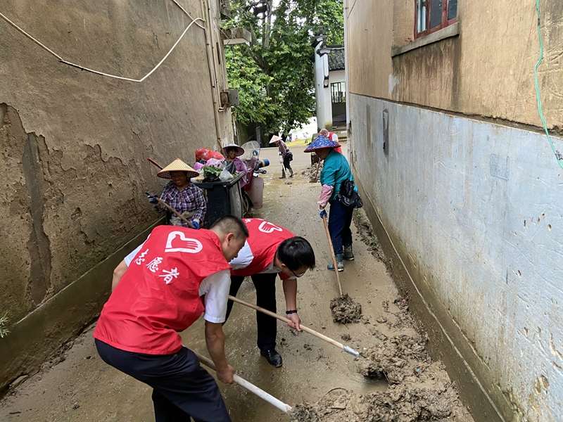婺源县支行志愿者帮助受灾群众清理淤泥