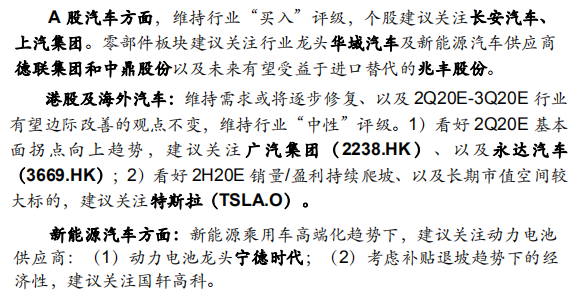 光大证券分析,受此次疫情影响,汽车时钟于2-4月进入复苏时区内“颠簸期”,伴随疫情的控制,2020年3月成为汽车时钟复苏时区内的二次拐点。7月乘用车销量恢复至我们预测值的119%,疫情影压抑的需求正在发生一定程度的回补,行业目前仍运转于本轮周期的复苏时区。展望三季度,汽车需求增速将由自身库存周期及政策决定,预计三季度末开始再次边际加速上行,三季报前后零部件子板块或成为配置主线,建议重点配置。
