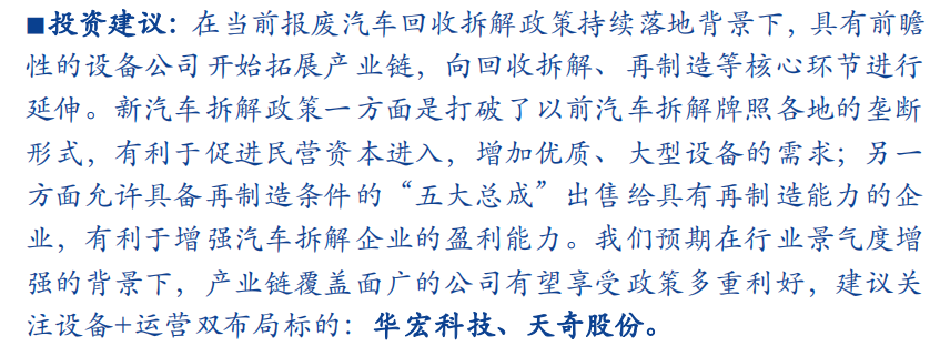 安信证券表示,为了稳定和鼓励汽车消费市场,今年以来中国汽车工业协会呼吁出台增产促销政策。而汽车拆解作为连接销售制造重要一环,理顺汽车拆解行业,促进旧车回收激励新车消费;有效利用旧车资源循环利用降低资源消耗,都是我国经济高质量增长的题中应有之义,未来国家有望持续推进产业发展。