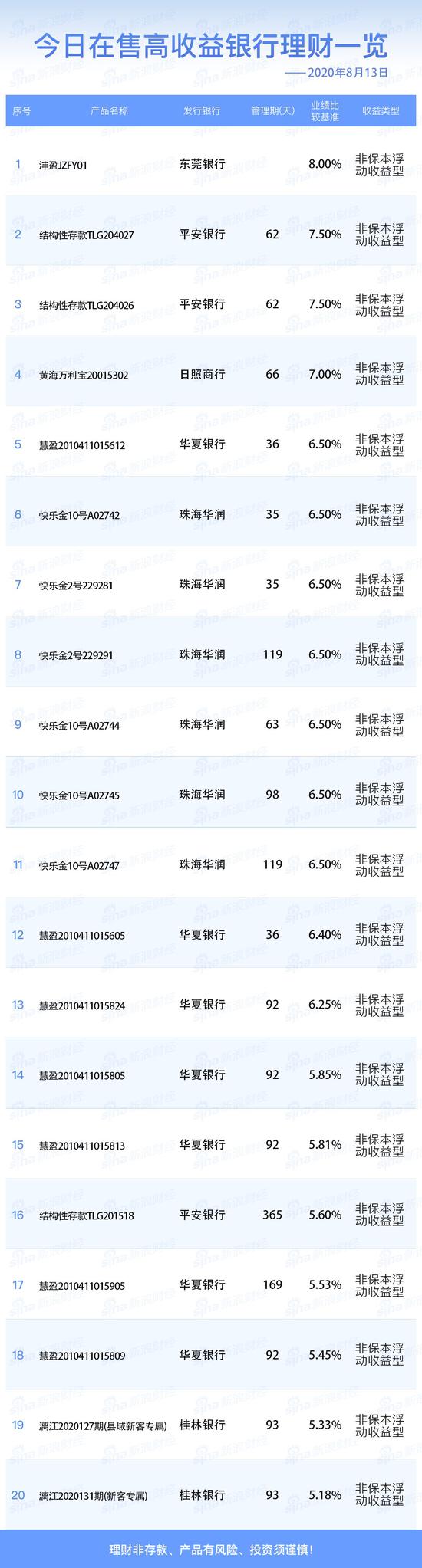 8月13日在售高收益银行理财产品:今日业绩比较基准在7.00%及以上的银行人民币理财产品共4款。东莞银行的“沣盈JZFY01”业绩比较基准最高,为8.00%。