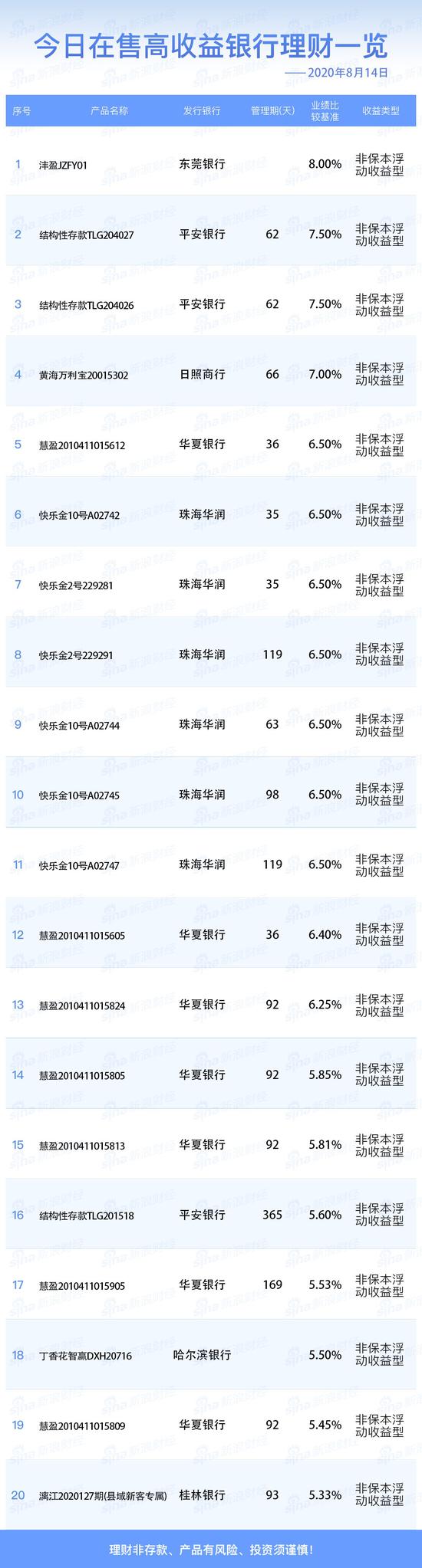 8月14日在售高收益银行理财产品:今日业绩比较基准在7.00%及以上的银行人民币理财产品共4款。东莞银行的“沣盈JZFY01”业绩比较基准最高,为8.00%。