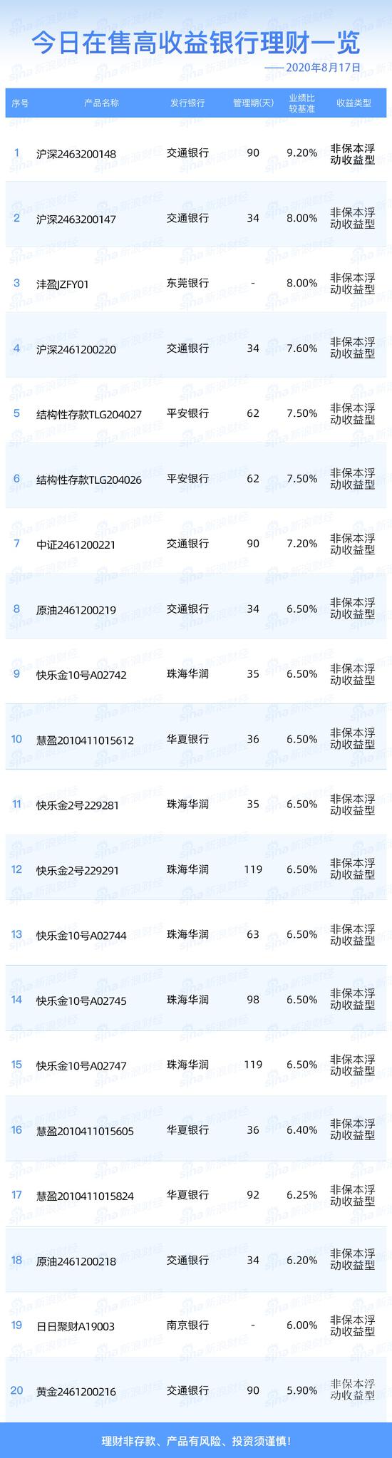 8月17日在售高收益银行理财产品:今日业绩比较基准在7.00%及以上的银行人民币理财产品共7款。交通银行(4.860, 0.07, 1.46%)的“沪深2463200148”业绩比较基准最高,为9.20%。