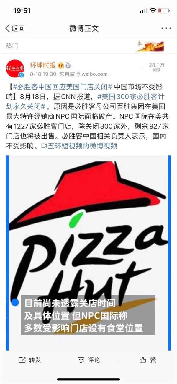 而对于美国门店关闭,必胜客中国回应称:中国市场不受影响。
