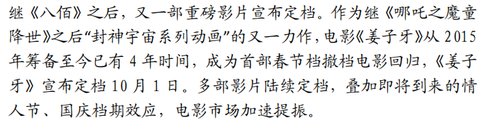 此外,中航证券表示,目前,目前,北京、上海、杭州、成都等部分影院已确认已经收到相关通知。8月14日起,除了上座率从30%提高到50%之外,观看片长超过2小时的影片必须中场休息的限制也将放宽。上座率的提升对电影行业来说无疑利好的,有望崔进更多优质影片回归市场,带动整体票房市场的上扬。