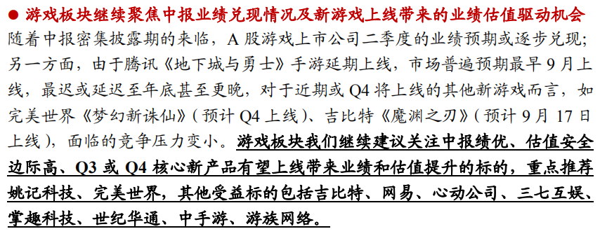 开源证券分析,游戏板块继续聚焦中报业绩兑现情况及新游戏上线带来的业绩估值驱动机会。随着中报密集披露期的来临,A股游戏上市公司二季度的业绩预期或逐步兑现;另一方面,由于腾讯《地下城与勇士》手游延期上线,市场普遍预期最早9月上线,最迟或延迟至年底甚至更晚,对于近期或Q4将上线的其他新游戏而言,如完美世界《梦幻新诛仙》(预计Q4上线)、吉比特《魔渊之刃》(预计9月17日上线),面临的竞争压力变小。