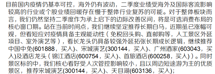 东方证券表示,1)免税回调体现市场对线上销售及供货的担忧,但我们强调线上线下必须作为整体去看待,另外供货紧缺是短期现象,不改板块长期逻辑,看后续政策催化仍在继续,板块关注度有望持续;2)7月中旬跨省旅游恢复以来,旅游业明显好转,如高端定制游需求已超过去年同期、旅行社密集复工等,我们认为旅行业已进入快速复苏阶段,建议持续关注景区、餐饮、酒店等板块的盈利修复。