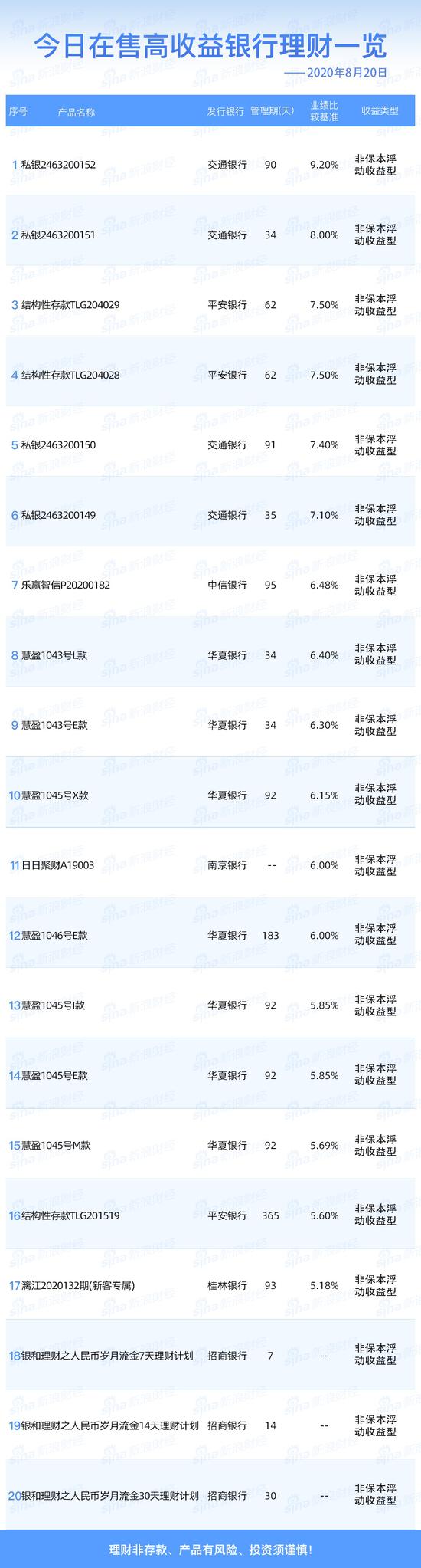 8月20日在售高收益银行理财产品:今日业绩比较基准在7.00%及以上的银行人民币理财产品共6款。交通银行(4.770, -0.02, -0.42%)的“私银2463200152”业绩比较基准最高,为9.20%。