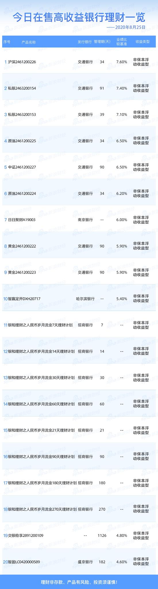 8月25日在售高收益银行理财产品:今日业绩比较基准在7.00%及以上的银行人民币理财产品共3款。交通银行(4.760, 0.00, 0.00%)的“沪深2461200226”业绩比较基准最高,为7.60%。