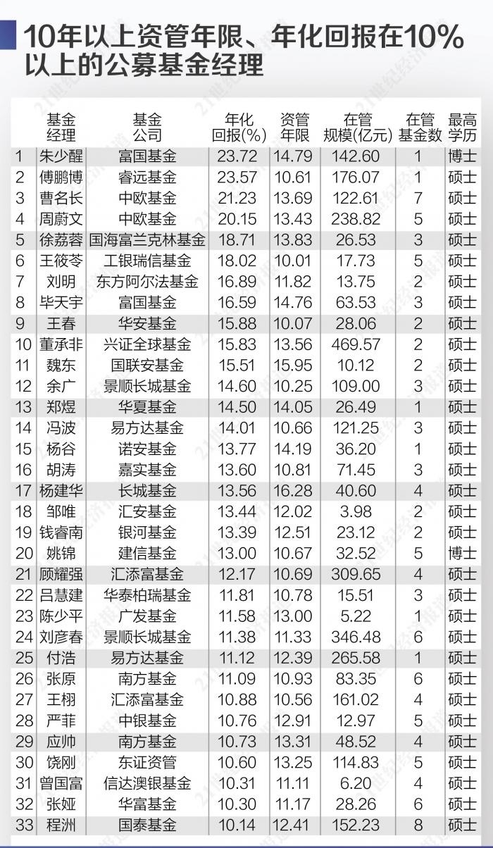 21世纪资本研究院以10年周期为统计期限研究,整个行业有10年资管年限,且年化收益超过10%的公募基金经理仅有33位。
