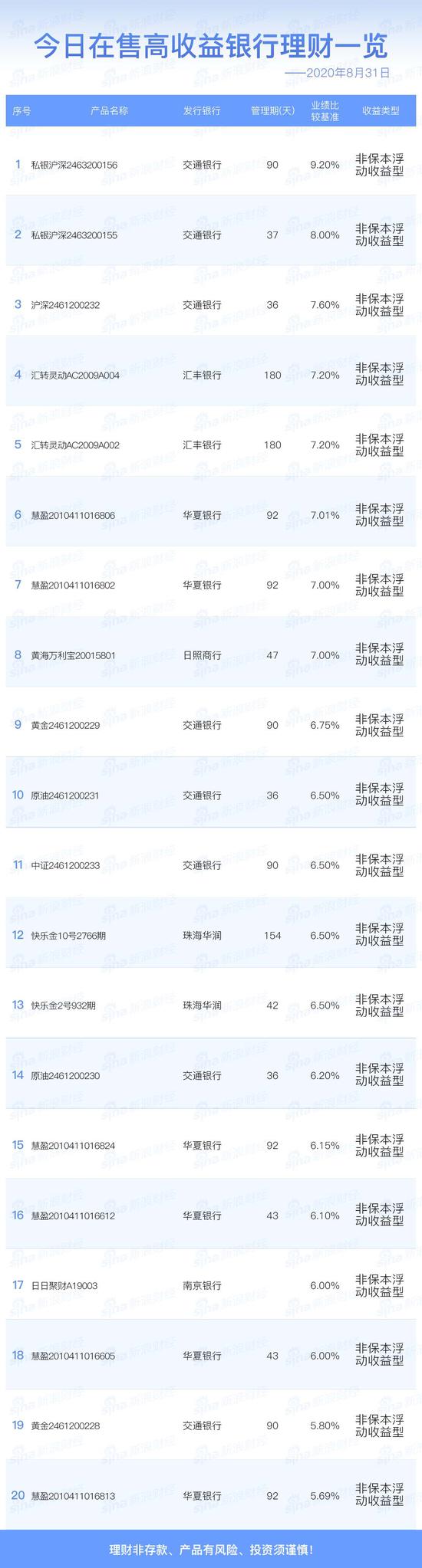 8月31日在售高收益银行理财产品一览