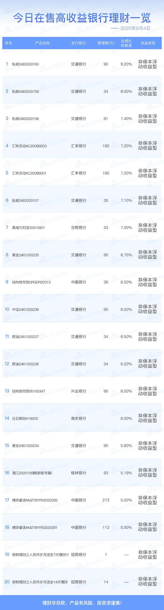 9月4日在售高收益银行理财产品:今日业绩比较基准在8.00%及以上的银行人民币理财产品共2款。交通银行(4.640, -0.03, -0.64%)的“私银2463200160”业绩比较基准最高,为9.20%。