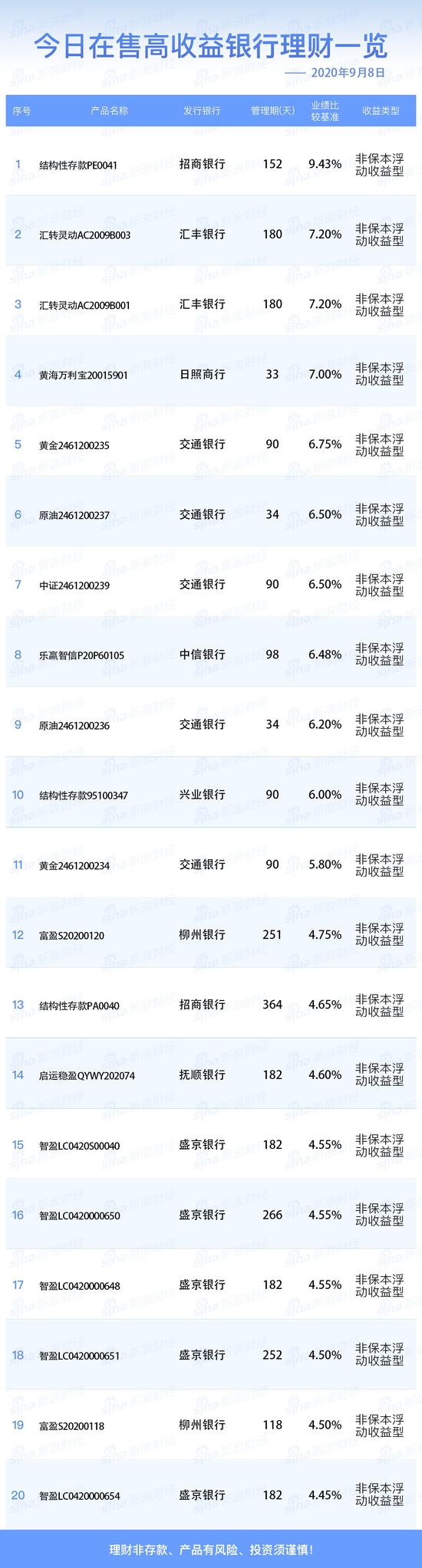 9月8日在售高收益银行理财产品:今日业绩比较基准在7.00%及以上的银行人民币理财产品共4款。招商银行(37.150, 0.36, 0.98%)的“结构性存款PE0041”业绩比较基准最高,为9.43%。