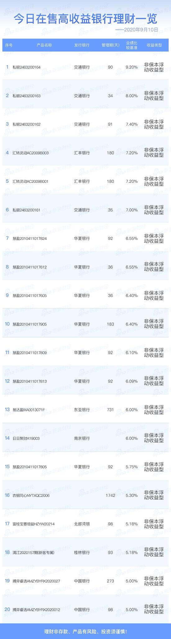 9月10日在售高收益银行理财产品一览