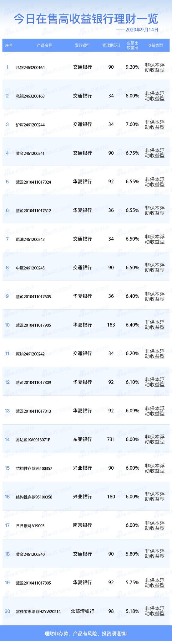 9月14日在售高收益银行理财产品:今日业绩比较基准在7.00%及以上的银行人民币理财产品共3款。交通银行(4.610, 0.00, 0.00%)的“私银2463200164”业绩比较基准最高,为9.20%。