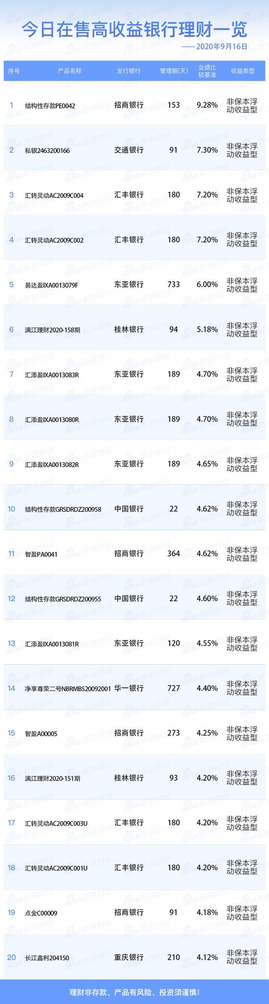 9月16日在售高收益银行理财产品一览