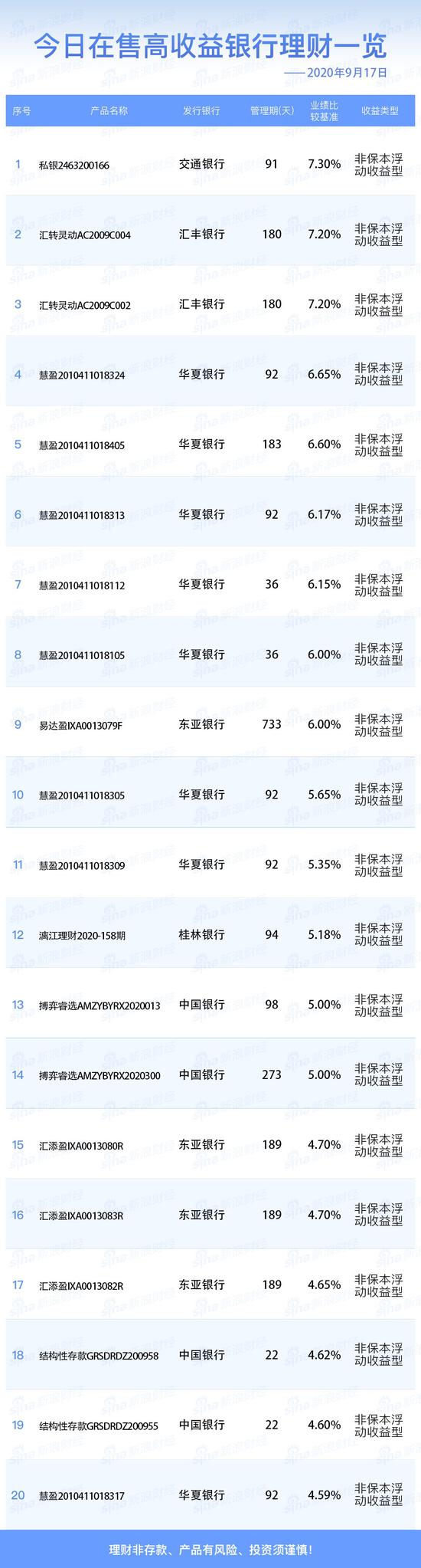 9月17日在售高收益银行理财产品:今日业绩比较基准在7.00%及以上的银行人民币理财产品共3款。交通银行(4.640, -0.01, -0.22%)的“私银2463200166”业绩比较基准最高,为7.30%。