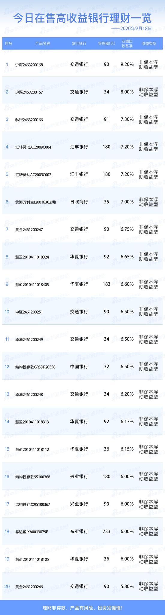 9月18日在售高收益银行理财产品:今日业绩比较基准在8.00%及以上的银行人民币理财产品共2款。交通银行(4.640, 0.00, 0.00%)的“沪深2463200168”业绩比较基准最高,为9.20%。