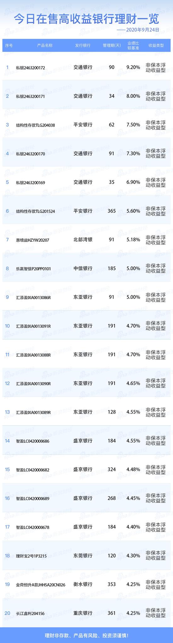9月24日在售高收益银行理财产品:今日业绩比较基准在7.00%及以上的银行人民币理财产品共4款。交通银行(4.590, -0.02, -0.43%)的“私银2463200172”业绩比较基准最高,为9.20%。