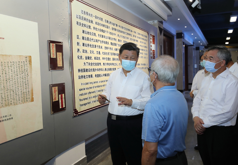 随后,习近平参观了具有潮汕侨乡特色的侨批文物馆。过去很长一段时间,海外华侨通过民间渠道将连带家书或简单附言的汇款凭证寄回国内,这些“侨批”成为研究近代华侨史的珍贵档案。习近平听取侨批历史和潮汕华侨文化介绍。他强调,“侨批”记载了老一辈海外侨胞艰难的创业史和浓厚的家国情怀,也是中华民族讲信誉、守承诺的重要体现。要保护好这些“侨批”文物,加强研究,教育引导人们不忘近代我国经历的屈辱史和老一辈侨胞艰难的创业史,并推动全社会加强诚信建设。潮汕地区是我国著名侨乡。汕头经济特区要根据新的实际做好“侨”的文章,加强海外华侨工作,引导和激励他们在支持和参与祖国现代化建设、弘扬中华文化、促进祖国和平统一、密切中外交流合作等方面发挥更大作用。