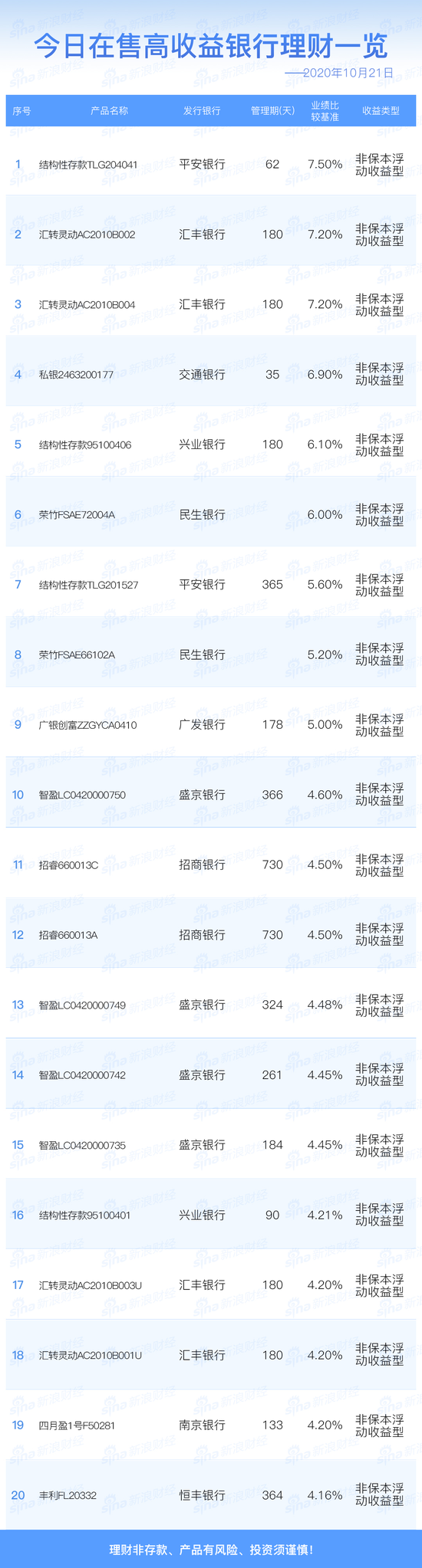 10月21日在售高收益银行理财产品:今日业绩比较基准在7.00%以上的银行人民币理财产品共3款。平安银行(17.460, -0.08, -0.46%)的“结构性存款TLG204041”业绩比较基准最高,为7.50%。