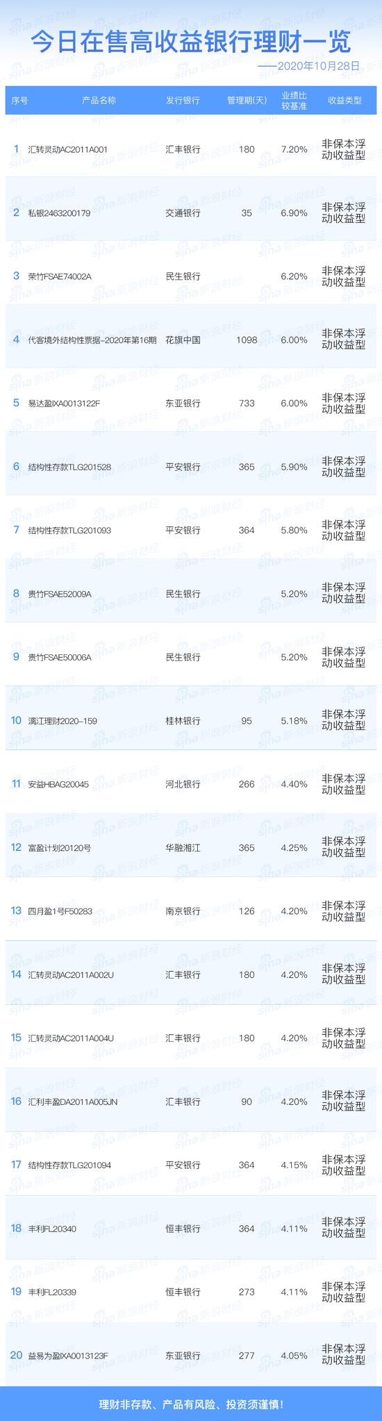 10月28日在售高收益银行理财产品