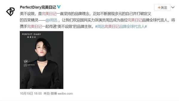 10月19日,完美日记官宣了周迅为首位品牌全球代言人,业内认为这是完美日记品牌升级的标志性。且在该轮营销所展示的内容中,品牌的设计风格趋于成熟与内敛,此前偏向于年轻化的风格与鲜活的色彩也不复得见,显著的向着诸如Dior、Armani等国际高端品牌的风格靠拢。