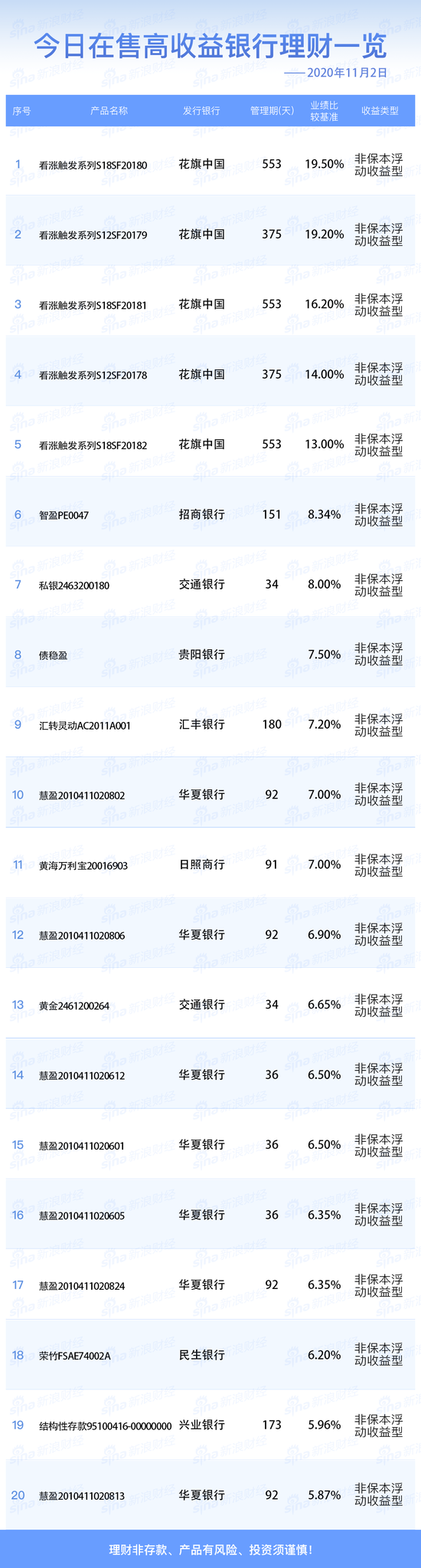 11月2日在售高收益银行理财产品:今日业绩比较基准在13.00%及以上的银行人民币理财产品共5款。花旗中国的“看涨触发系列S18SF20180”业绩比较基准最高,为19.50%。