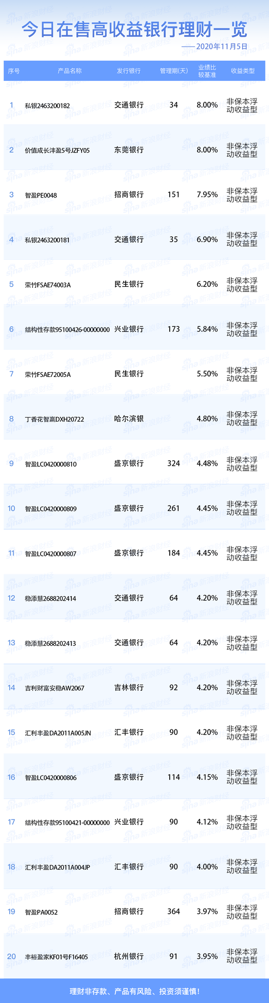 11月5日在售高收益银行理财产品