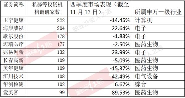 虽然市场表现的风格已经出现了转变,但是机构调研风格还没有出现明显的变化,医药和科技类上市公司,尤其是细分板块龙头公司,依旧是私募基金关注的焦点。其中,卫宁健康、海康威视和歌尔股份是私募基金参与调研最多的3家公司,截至11月22日,四季度以来它们分别被222家、204家和178家私募基金调研。