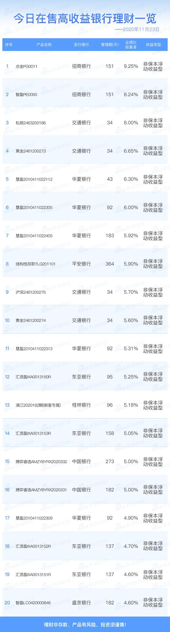 11月23日在售高收益银行理财产品:今日业绩比较基准在6%及以上的银行人民币理财产品共6款。招商银行(45.310, 0.26, 0.58%)的“点金PG0011”业绩比较基准最高,为9.25%。