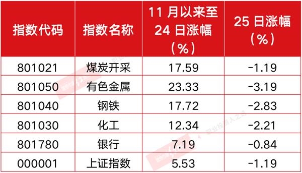 进入11月份以来,煤炭、有色、钢铁、化工和银行等顺周期行业纷纷领涨两市,“煤飞色舞”重获市场共识。但11月25日“煤飞色舞”按下暂停键,据《红周刊》记者统计,截至收盘,有色金属指数(申万)和钢铁指数(申万)等的跌幅均要远超沪指。那么,“煤飞色舞”行情还能重启吗?