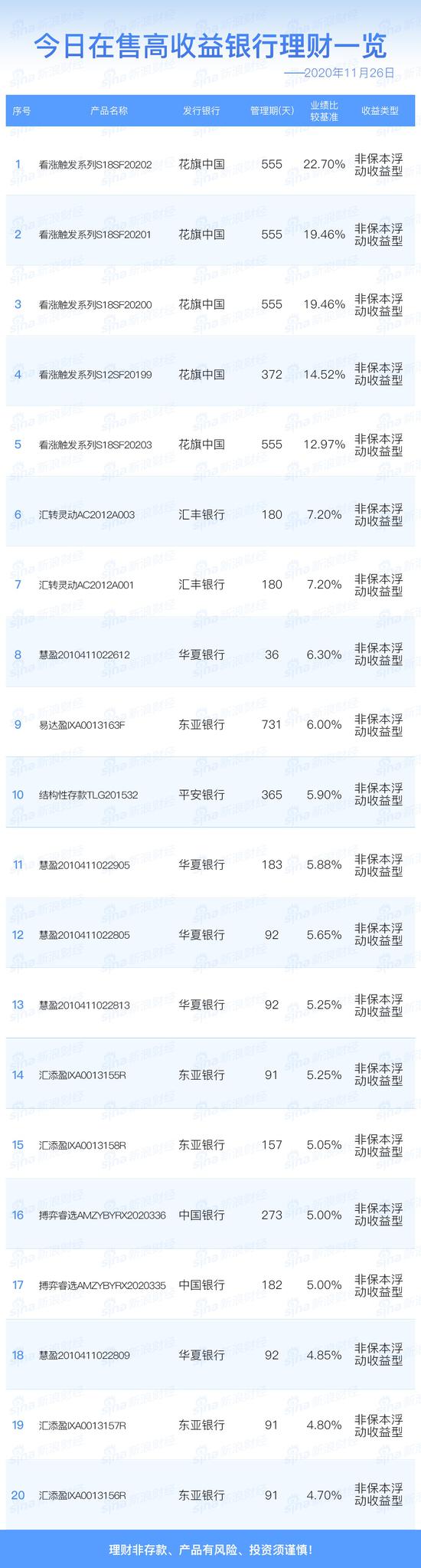 11月26日在售高收益银行理财产品