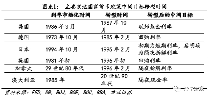 从美欧日等发达国家的经验来看,货币政策框架从数量型向价格型调控的转型是大势所趋。自20世纪80年代以来,伴随着利率市场化和金融市场的不断发展,美欧日等发达国家开始向盯住利率的货币政策框架转型,中介目标从M1、M2转向联邦基金利率、隔夜拆借利率等。