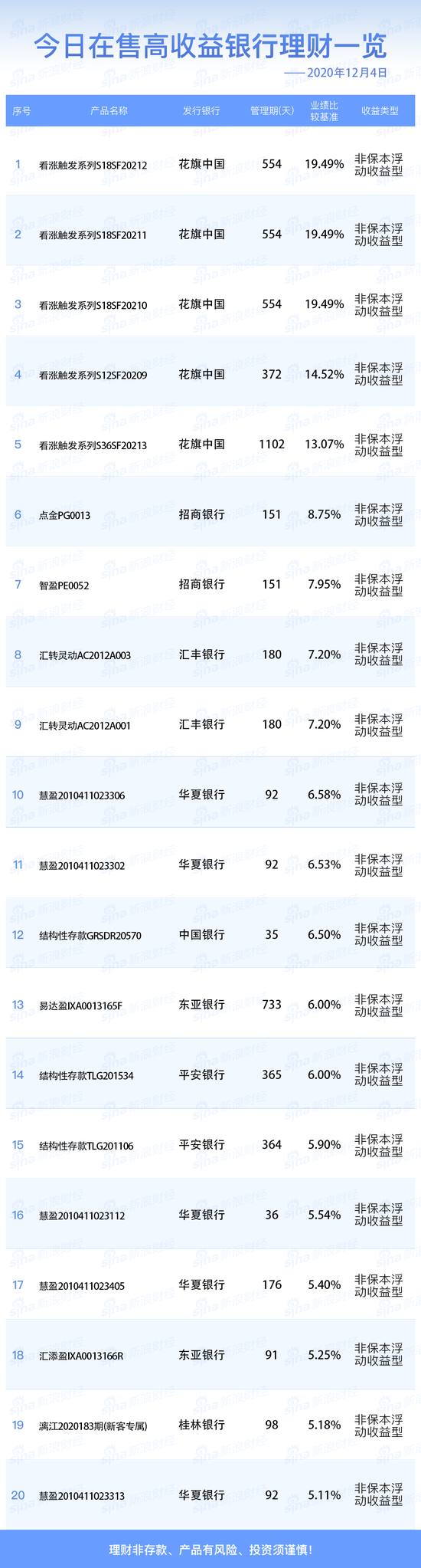 12月4日在售高收益银行理财产品:今日业绩比较基准在8%以上的银行人民币理财产品共6款。花旗中国“看涨触发系列S18SF20212”业绩比较基准最高,为19.49%。