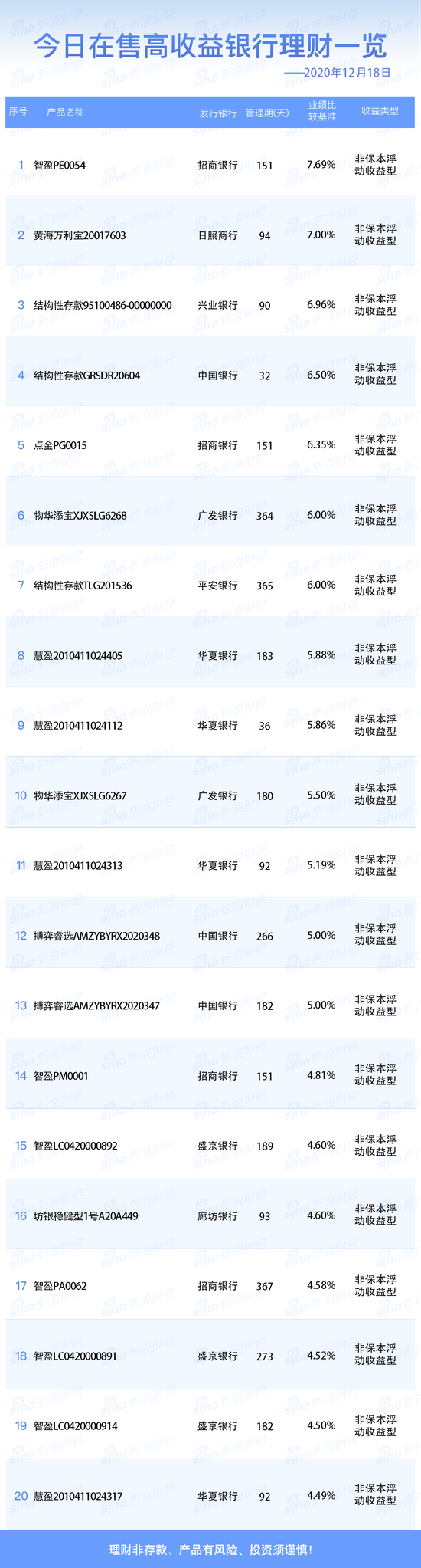 12月18日在售高收益银行理财产品