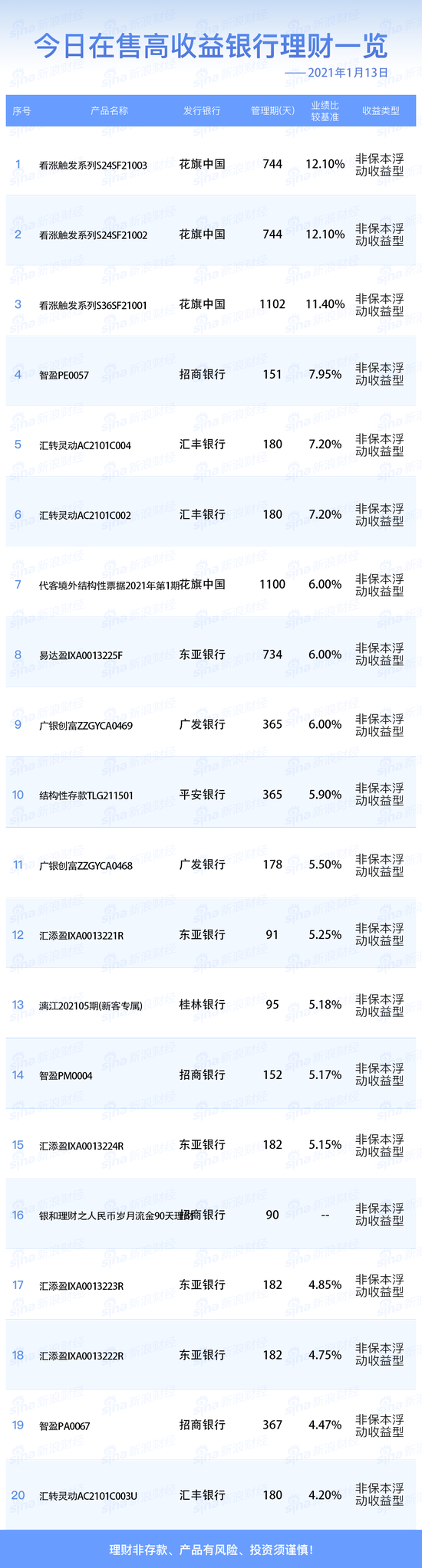 1月13日在售高收益银行理财产品