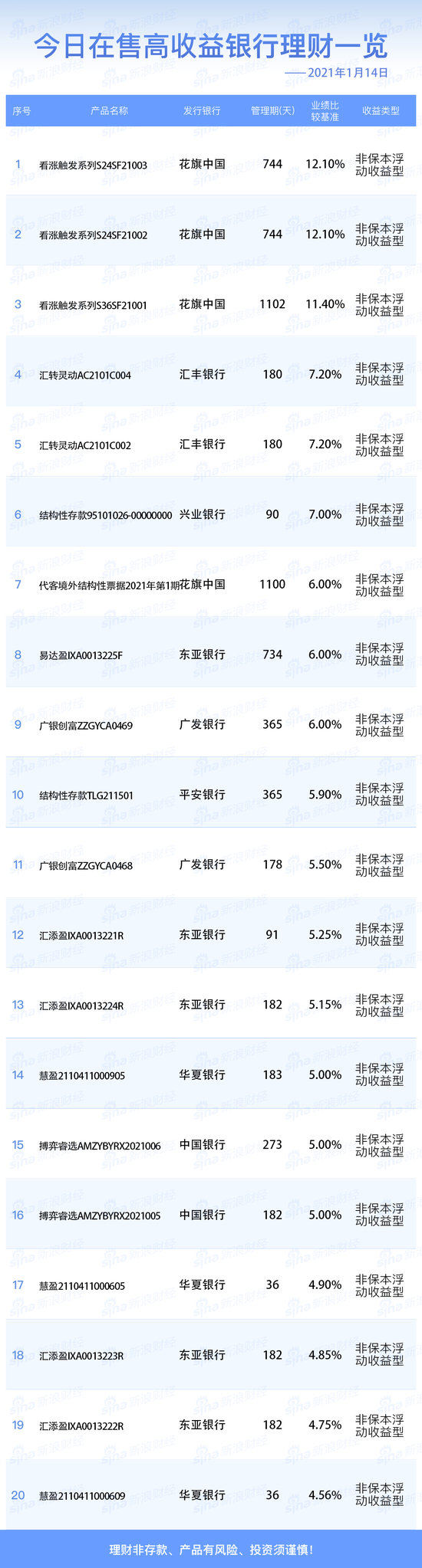 1月14日在售高收益银行理财产品