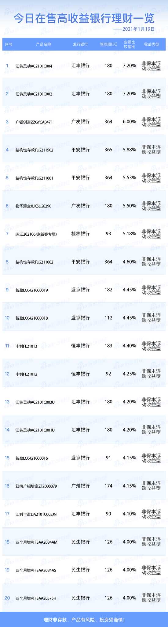 1月19日在售高收益银行理财产品:今日业绩比较基准在6%以上的银行人民币理财产品共3款。汇丰银行“汇转灵动AC2101C004”业绩比较基准最高,为7.20%。