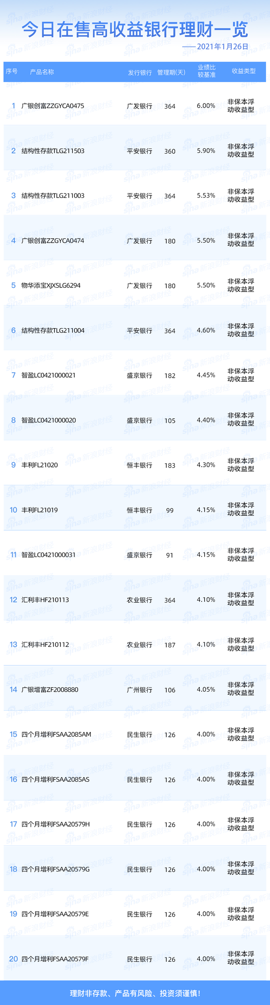 摘要:  1月26日在售高收益银行理财产品:今日业绩比较基准在5%以上的银行人民币理财产品共5款。广发银行“广银创富ZZGYCA0475”业绩比较基准最高,为6.00%。