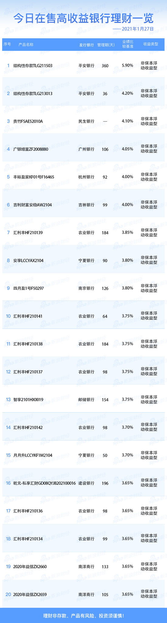 1月27日在售高收益银行理财产品