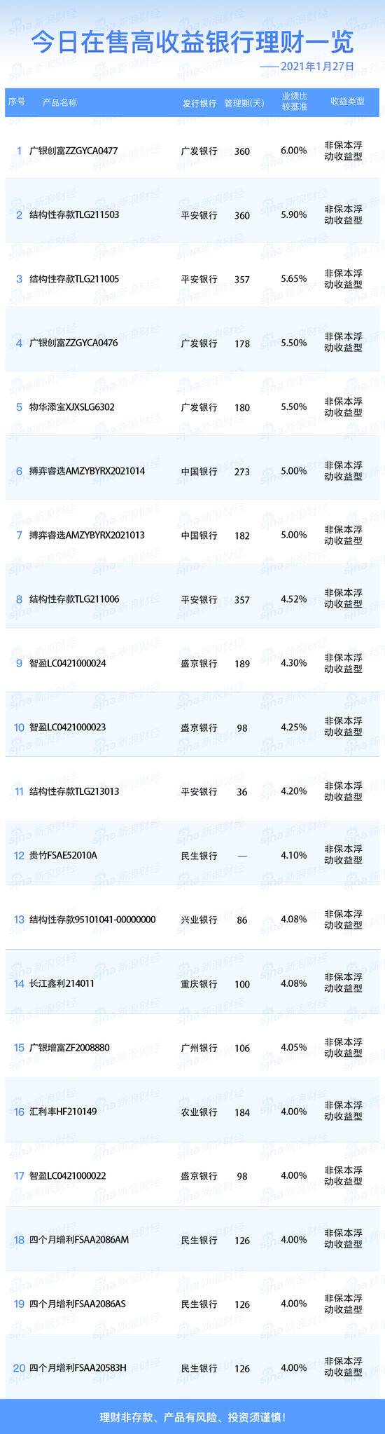 1月28日在售高收益银行理财产品:今日业绩比较基准在5%以上的银行人民币理财产品共7款。广发银行“广银创富ZZGYCA0477”业绩比较基准最高,为6.00%。