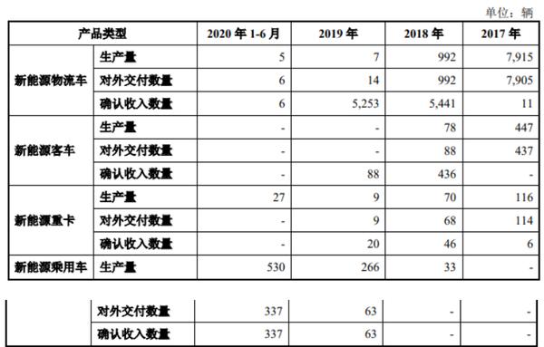 招股书显示,大运汽车新能源物流车生产量从2017年的7915辆降至2020年上半年的5辆,新能源客车生产量从447辆降为0,而新能源乘用车从0提至530辆。