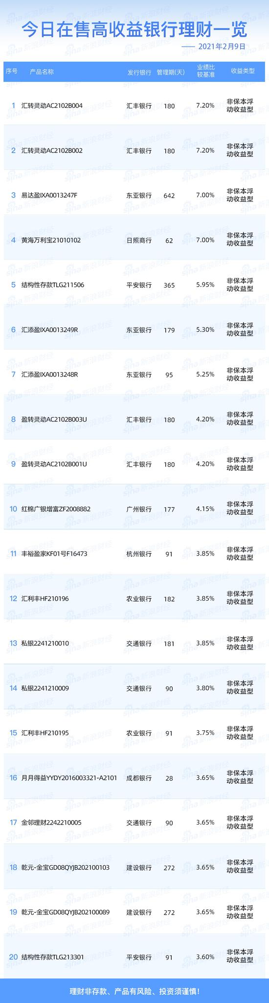 2月9日在售高收益银行理财产品